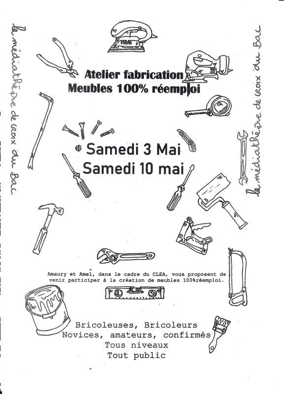 Après le temps de sensibilisation du samedi 3 mai, Amaury et Armel proposent de faire une co-conception de meubles. Les arrivées en cours de journée pourront se greffer à des projets en cours… le midi pique-nique sur place. venez nombreux !