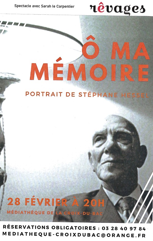 Le vendredi 28 février, Sarah Lecarpentier accompagnée du pianiste Simon Barzilay, raconte la vie de son grand-père Stéphane Hessel à la première personne et y mêle des textes personnels, comme une passerelle tendue entre les générations.