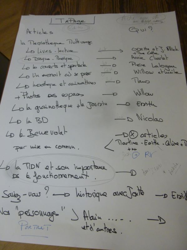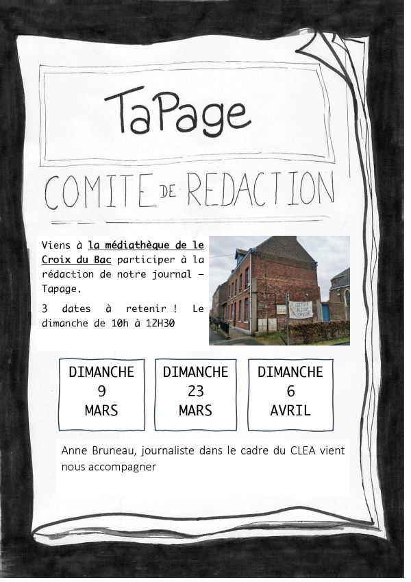 Le dimanche 11 mai à 11h : restitution commune avec Anne Bruneau et la présentation de la revue « TaPage » qui pourra trouver sa place dans son étagère fraichement installée ! nous terminerons par un repas collectif …..