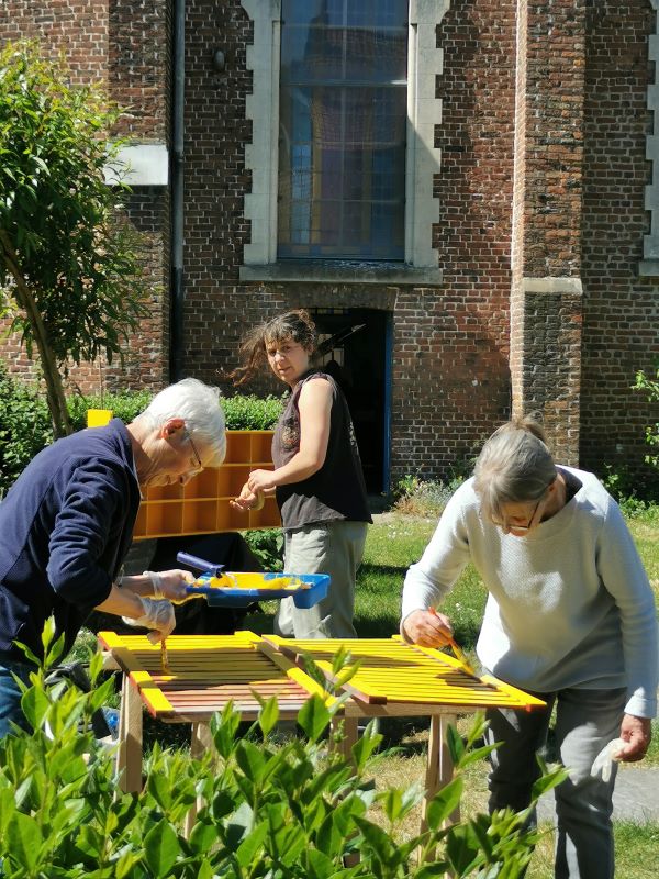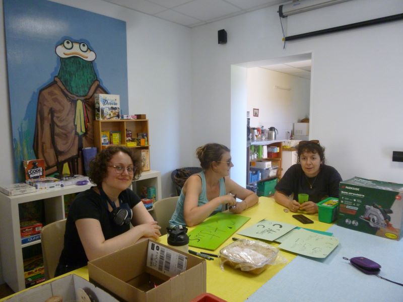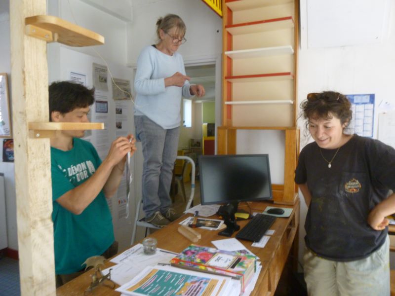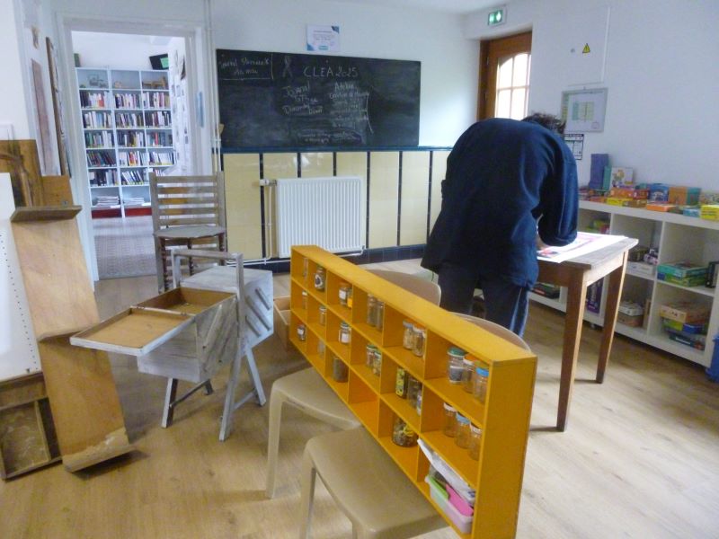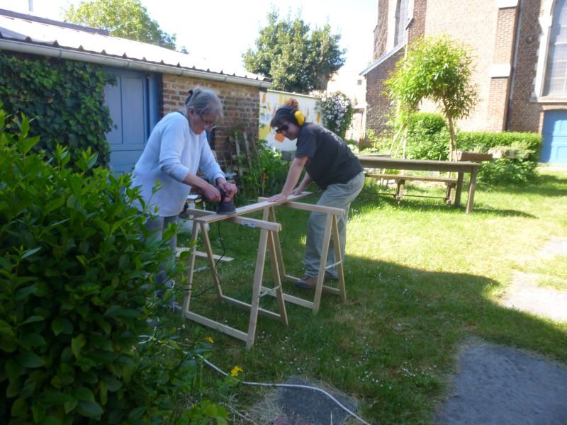 le samedi 3 mai nous avons parlé réemploi, puis fait le tour du grenier, des « cotches » pour récupérer planches, meubles non utilisés et voir ce que nous pourrions en faire tous ensemble le 10 mai, préparation de notices pour la fabrication (Les notices permettent de préciser quelle matière est ajoutée, enlevée et où est-ce qu’elle finira (car si on est 100% réemploi on souhaite aussi être 0 déchet.) …