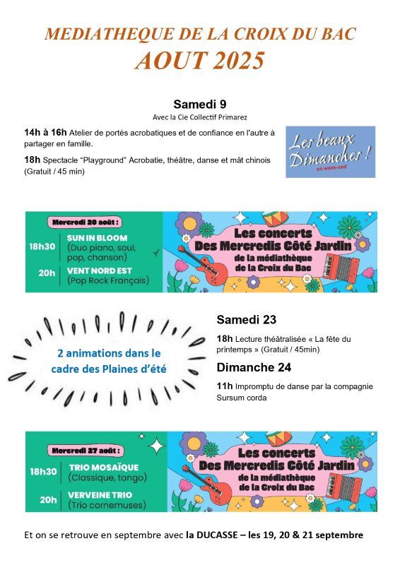 la médiathèque reste ouverte tout l’été avec plein de nouveautés ! également de nombreuses animations hors heures d’ouverture ! concerts, théâtre, atelier cirque etc etc