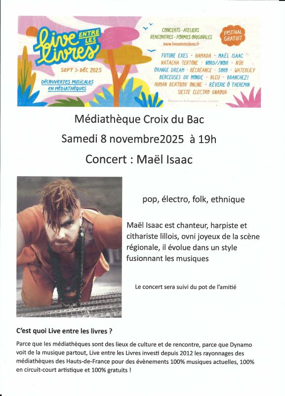 Depuis 2012 nous participons à l’événement Live entre les livres proposé par l’association « Dynamo ». Chaque année c’est une belle découverte musicale ! Cette année nous avons accueilli « Maël Isaac » artiste talentueux, difficile à classer, il n’a laissé personne indifférent, beaucoup se sont laissés porter et par la harpe et par la voix et vous êtes venus nombreux ! merci à tous