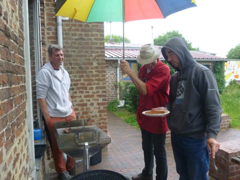 donc le « juke box à peu près » a été annulé…. pour le pique-nique repli dans la médiathèque… le barbecue sous parapluie … ambiance très conviviale, joyeuse et partageuse …. le DJ a été remplacé par des chansons, Véronique au bandonéon, son papa à la voix et Philippe à la guitare et bien sûr les hommes à la vaisselle !!