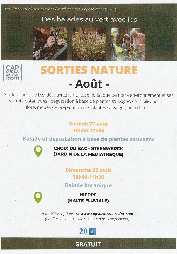 Emmenés par L’oasis des Mauvaises Herbes, partez à la découverte de la richesse de la Vallée de la Lys et de ses plantes comestibles : balade le long de la rivière, sensibilisation à la flore, dégustation de plantes sauvages