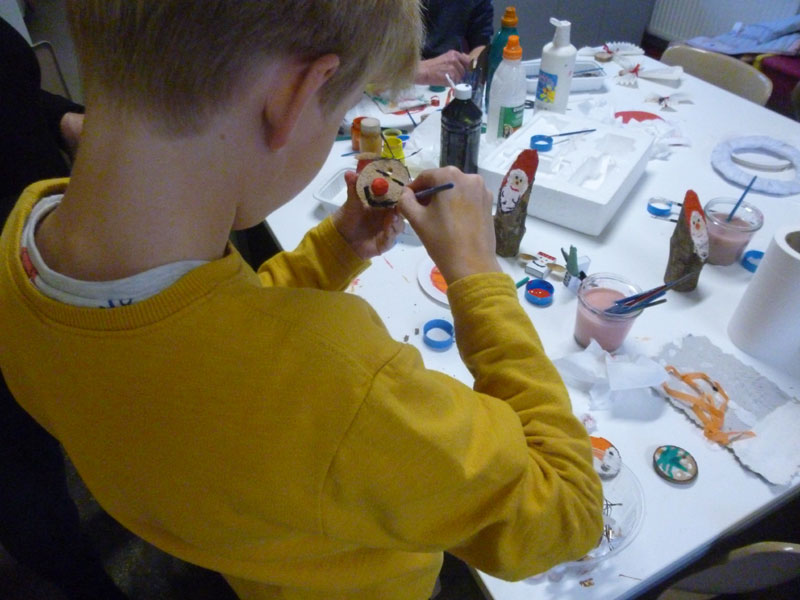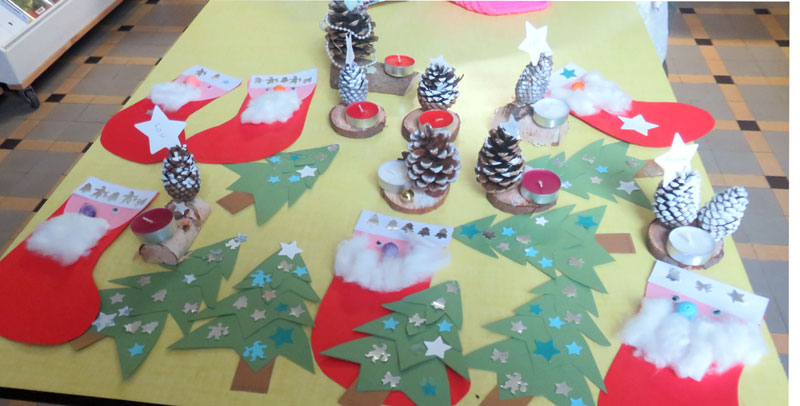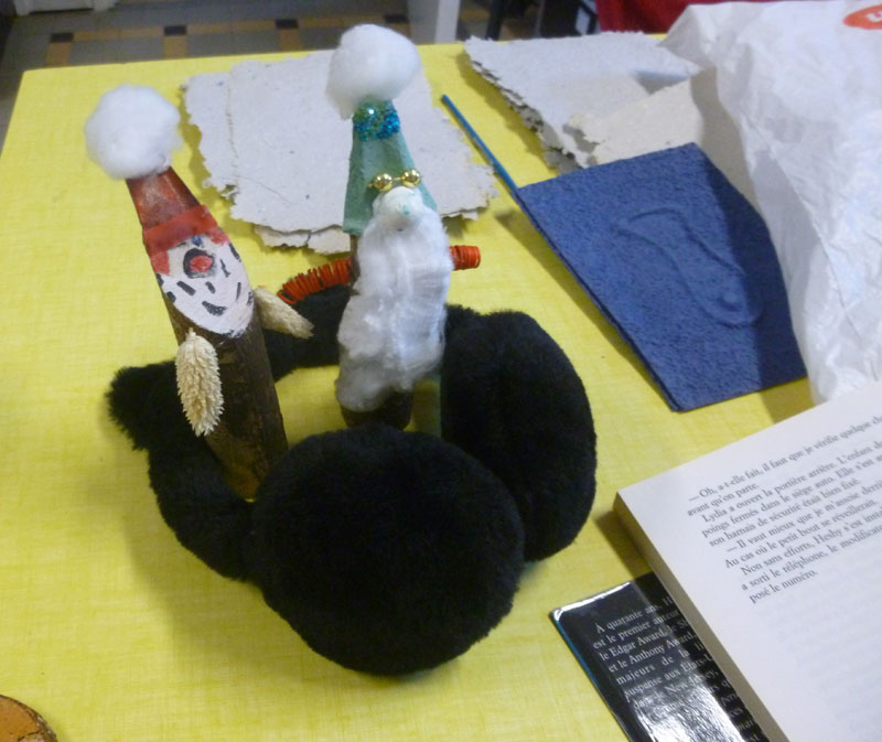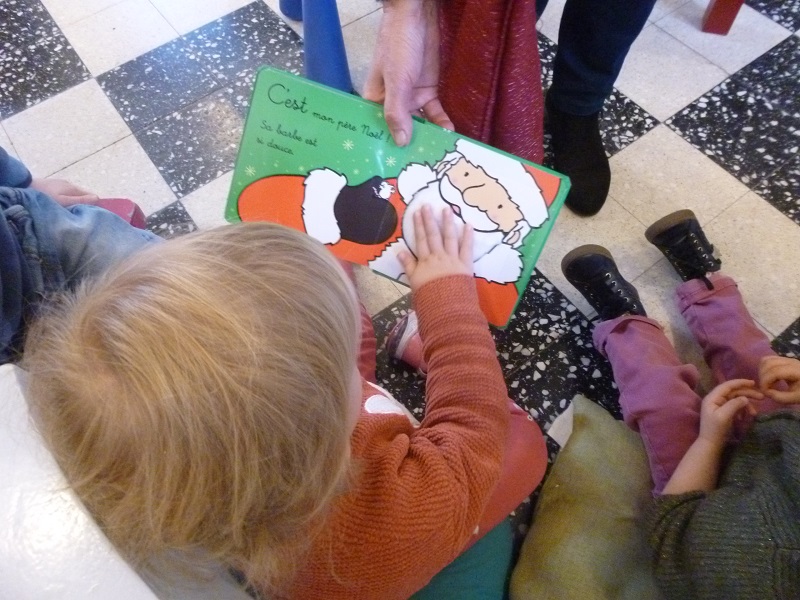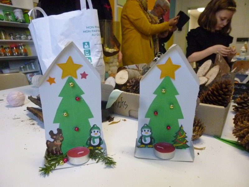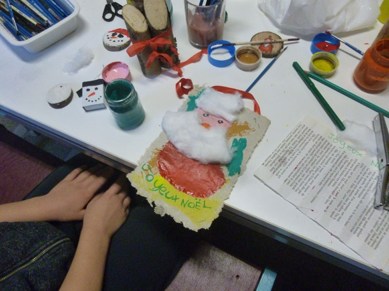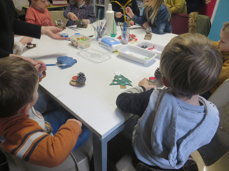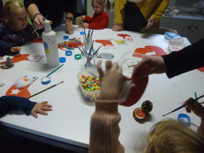atelier mode récup avec les enfants et les plus grands animé par Martine… matinée avec les élèves de l’école maternelle… chanter avec Maud, dessiner avec Martine, écouter des histoires avec Josette … kamischibaï de Noël pour les plus petits …