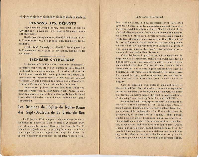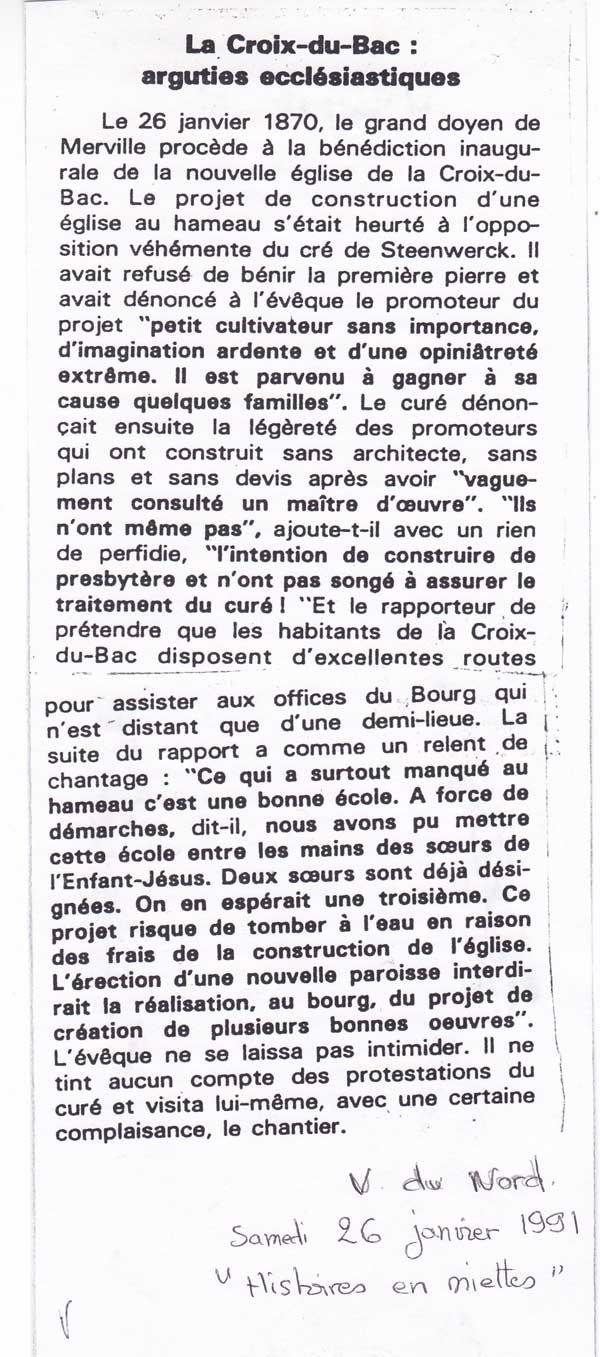 « En ce temps là, le 26 janvier 1870, les fidèles de la Croix du Bac avaient le cœur en fête, ils assistaient à la réalisation d’un rêve de plusieurs générations, la bénédiction de leur église et la reconnaissance de leur paroisse.