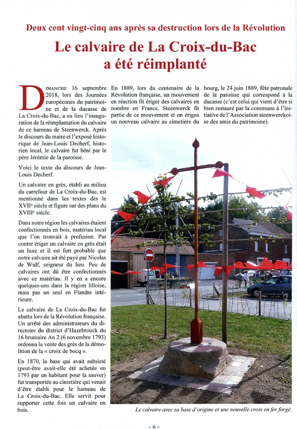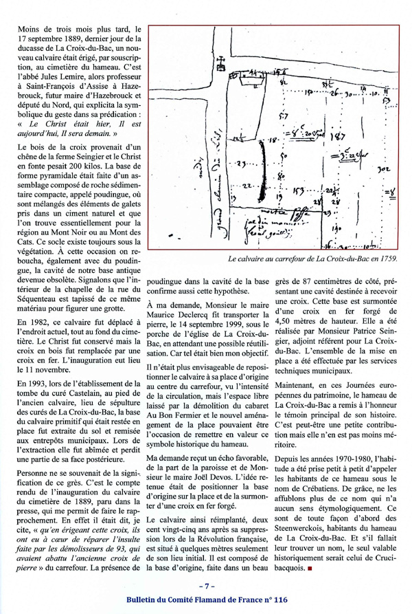 En 1892, on établit le calvaire au cimetière. Le Christ a été béni par l’Abbé Lemire, le bois de la croix provenait d’un chêne de la ferme Singier, le Christ en fonte pesait 200kgs, la croix 600kgs »