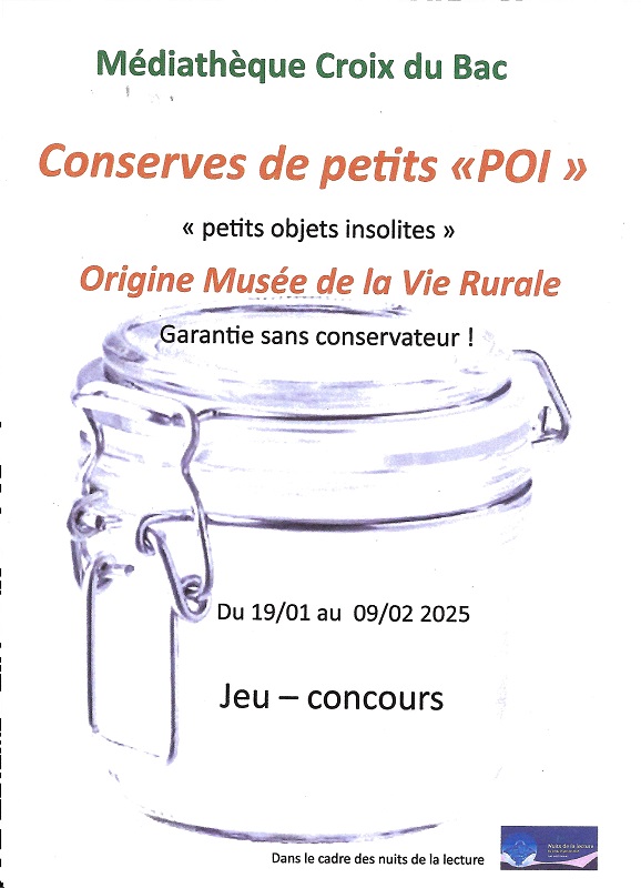comme le thème des nuits de la lecture était « les patrimoines », nous avons fait un partenariat avec le Musée de la Vie Rurale de Steenwerck pour mettre en avant les petits objets insolites avec un jeu-concours « conserves de petits « POI » garanti sans conservateur »….