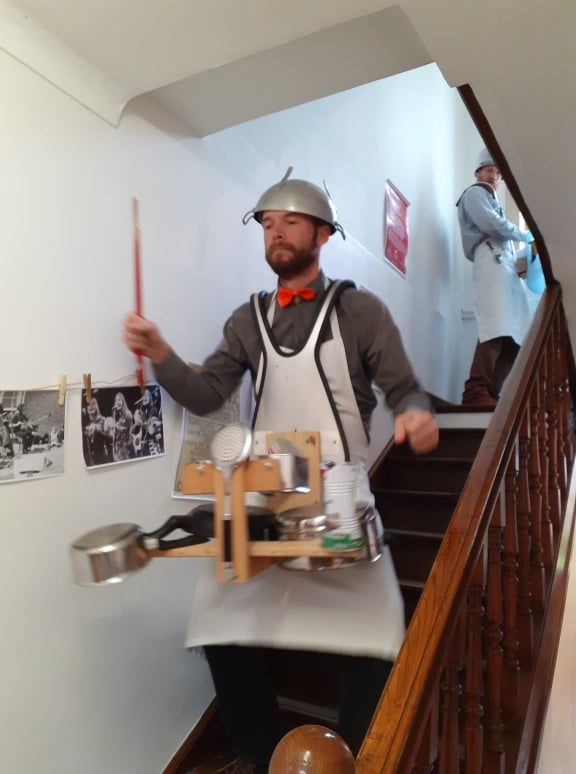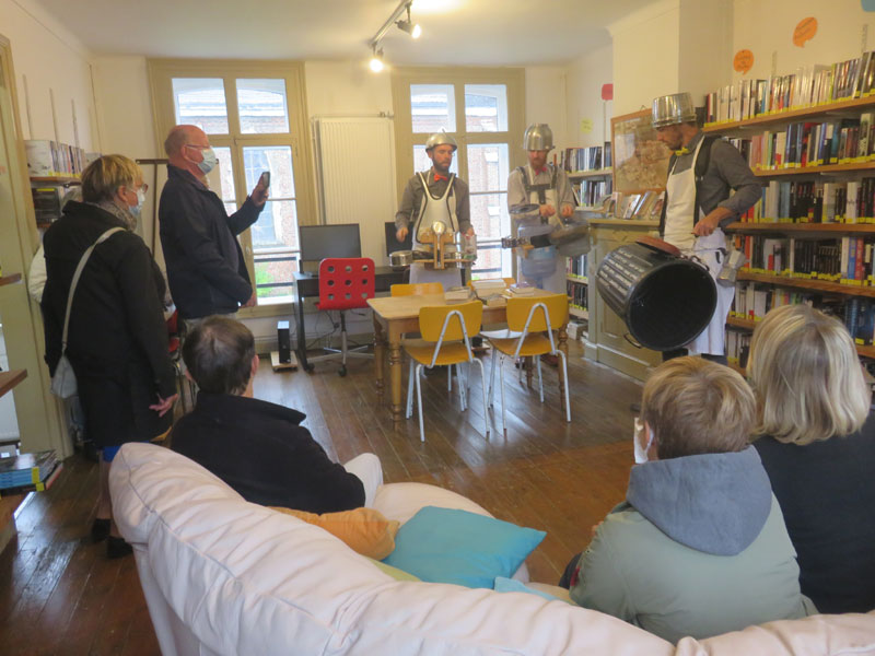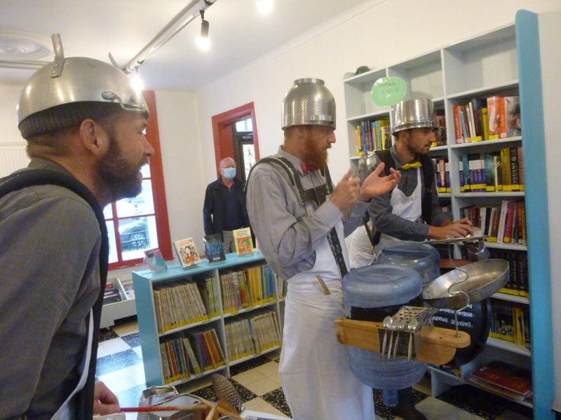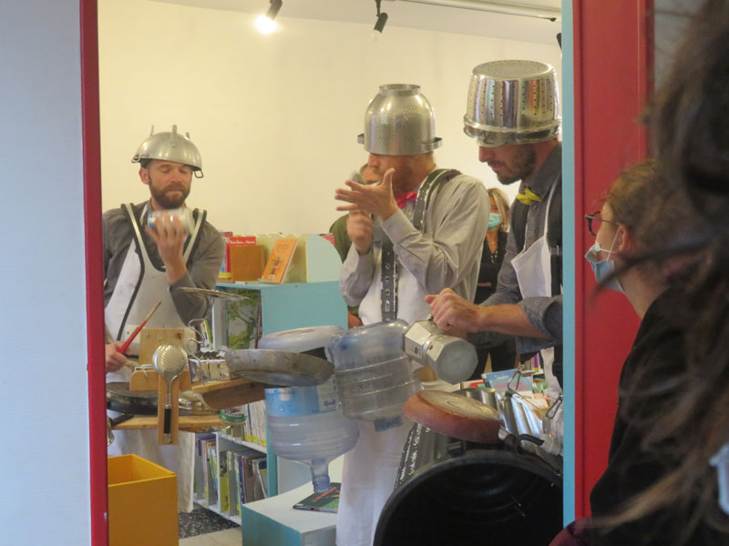 dimanche matin la pluie était au rendez-vous… donc impossible de faire la déambulation dans la rue, ni dans le jardin de la médiathèque… qu’à cela ne tienne ! le KGB a trouvé une solution …la déambulation se fera du grenier à la cave… merci à eux, aux spectateurs, et à la municipalité pour nous avoir proposé ce spectacle de rue….