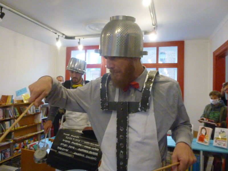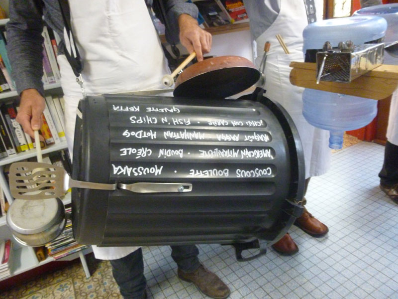 Aux fourneaux, trois chefs étoilés, réunis sous l’acronyme KGB – Kitchen Groove Band -, qui ont troqué pour l’occasion la toque traditionnelle pour une passoire en fer blanc du plus bel effet. Les voici maintenant en salle pour présenter leurs créations parmi lesquelles on ne saurait trop recommander le millefeuille à l’échalote, avec des frites !!, ou le Manhattan hot dog. Tout est bon pour ces virtuoses de la baguette : casseroles, poêles, boîtes de conserves, bidons en plastique ou encore poubelle. On a droit alors à un feu d’artifice d’inventivité, de fantaisie et d’humour qui ravit un public enthousiaste.